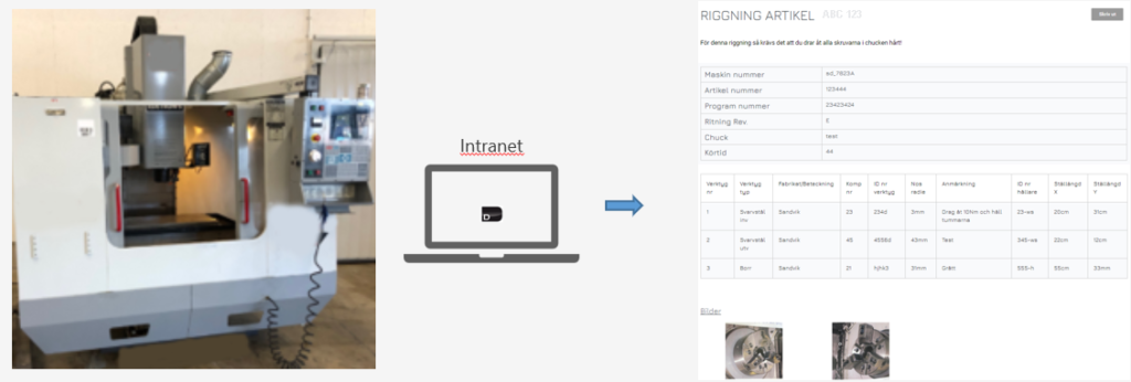 -Kunden hade riggningsinformation till varje CNC maskin i pärmar vilket de upplevde som ganska rörigt. Eftersom kunden redan hade ett intranet så nyttjade vi det och byggde in möjlighet att lagra riggningsinformation här.